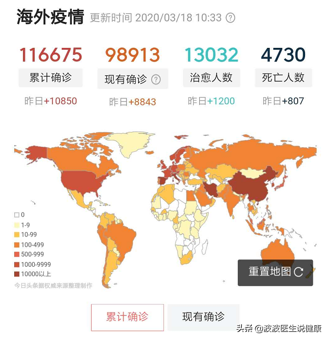 4截止到3月18日,国外累计确诊新冠肺炎116675例,死亡4730例。新冠肺炎在全球失控,正在大面积肆虐。
