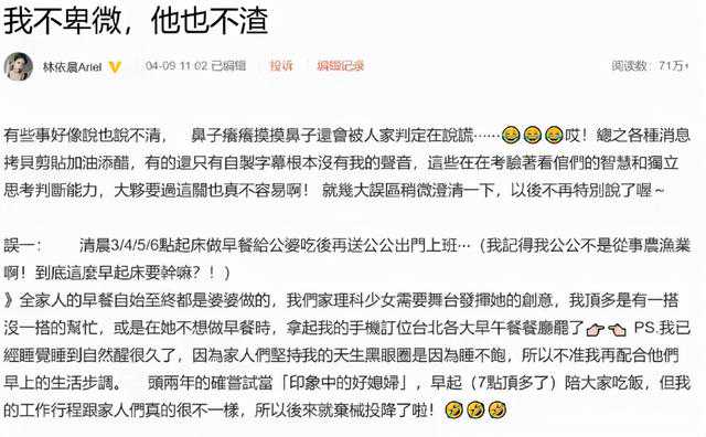 今年4月,林依晨特地发了一篇长文《我不卑微,他也不渣》: