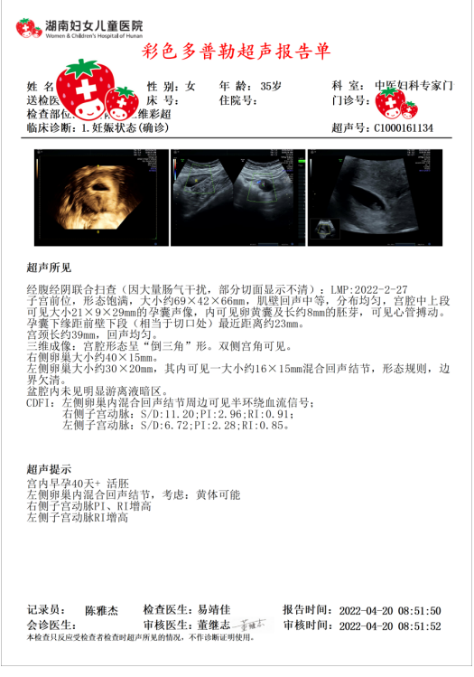 两个月后,小芳给雷教授报喜:怀孕了!抽血HCG:4814mIU/ml,/mL,/mL,显示胚胎一切正常。这时的小芳是既高兴又紧张,因为前两次的胎停,她担心会再次面临那种痛苦。雷教授鼓励小芳:“我们一起走下去,继续进行保胎治疗,一直到孕2月。”