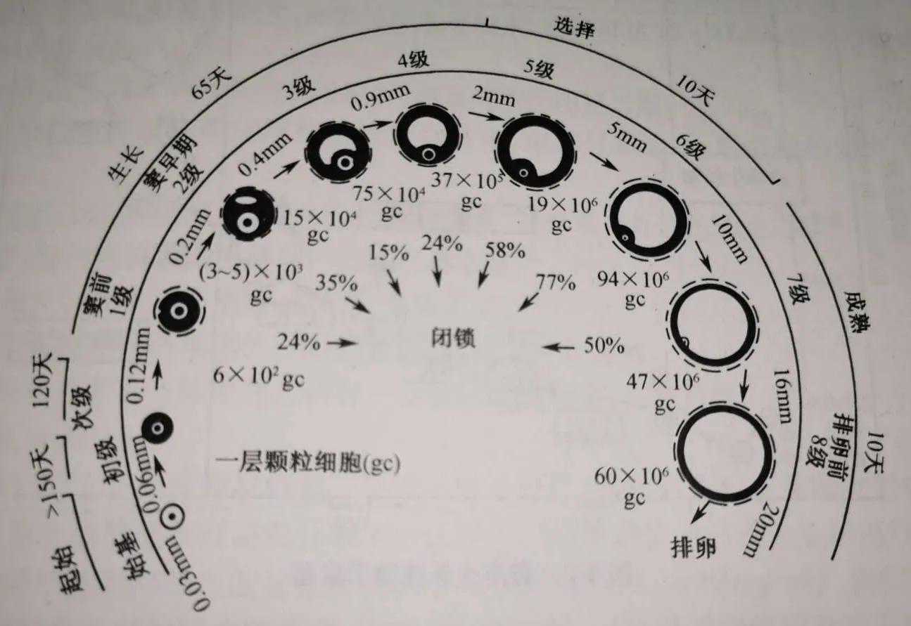 在门诊工作中,经常有进入试管周期的病人发问:自然状态下每月只排一枚卵泡,我现在促排,取了那么多卵,是把我后面半年甚至一年的卵都用了吗,我会不会老得更快?答案是:当然不会。女性生殖细胞数目的高峰是在胚胎16-20周时,约为600-700万。胎儿期卵泡不断闭锁,出生时约为200万个。儿童期多数卵泡退化,到青春期时约剩下30-50万。从青春期开始,卵泡受促性腺激素调控,一群群的始基卵泡被唤醒,进入其生长及成熟周期:始基卵泡—窦前卵泡—窦卵泡—成熟卵泡-排卵,这个过程一旦开始,就不允许后退,只有淘汰,不能留级。整个过程大概需要300多天,如下图。