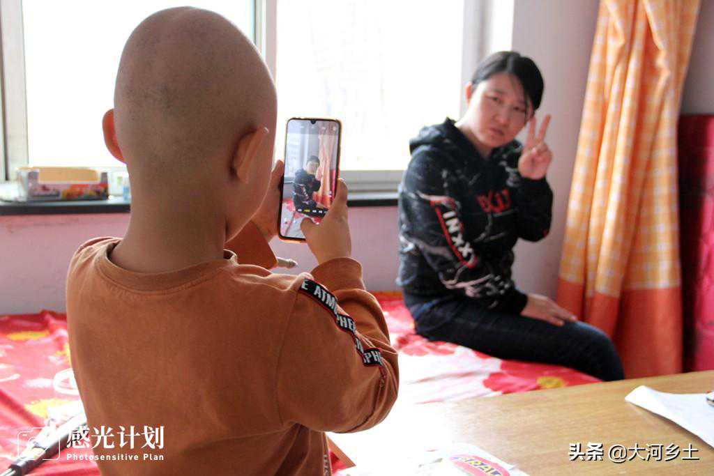 原始神经外胚层瘤是一种罕见的高度恶性的神经系统肿瘤,多发于儿童。医生说刘书岩的病发现及时,治愈率很高。7月8日,书岩在医院做了左大腿内侧肿瘤切除手术,随后开始化疗。三次化疗后,花费已高达13万元。“书岩生病前我在工地打工,攒了2万元,孩子生病后我以1万元的总价把家里的4亩地租了10年,又从亲戚处借了10万。”刘宝福说这才只是治疗的开始。图为9月19日,歇疗期间的书岩在出租屋给妈妈拍照。