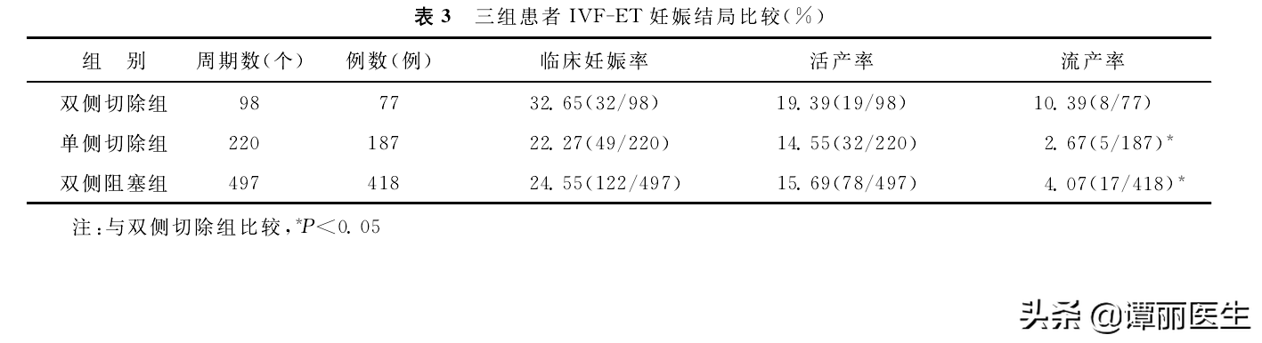三、3组患者IVF-ET妊娠结局的比较双侧切除组的流产率显著高于单侧切除组和双侧阻塞组(P<0.05);3组患者的临床妊娠率和活产率比较无显著性差异(P>0.05)(表3)。